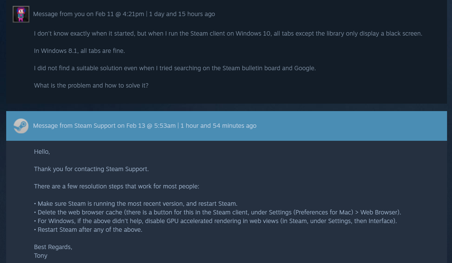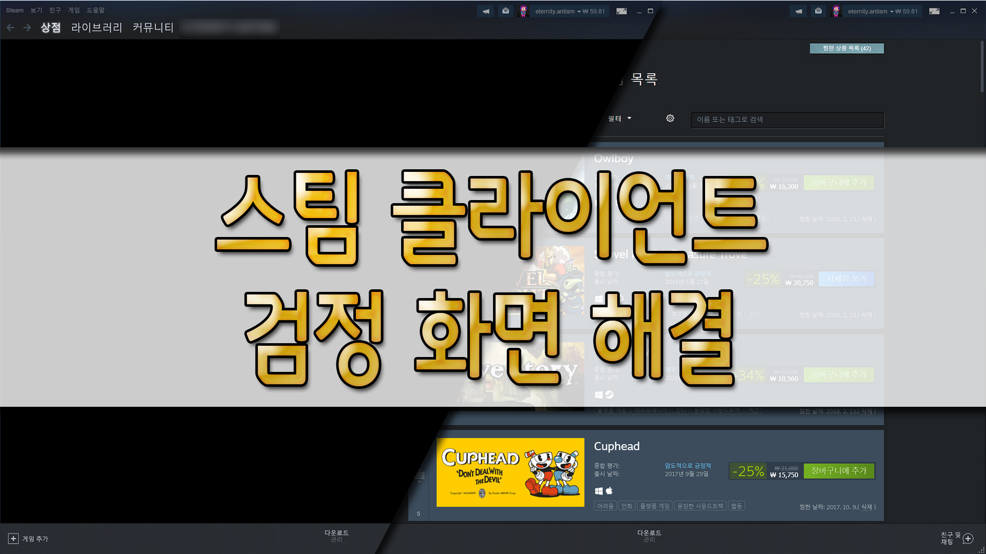 최근 (특히 윈도우 10에서) 스팀 클라이언트 혹은 스팀 런쳐(런처)를 샐행하면 라이브러리 외 모든 탭이 아래 이미지처럼 검정(검은 화면 혹은 black screen)으로 나오게 되는 때가 있는데, 이걸로 몇 일 고생하다가 스팀에도 문의한 결과 다음과 같은 과정을 따라 시도해보라고 했습니다.