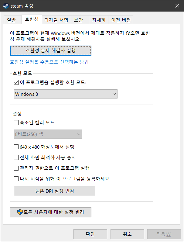 이런 내용인데, 윈도우 10에서는 이 방법이 먹히지 않아서 몇 일 더 찾아보다가, 서브 노트북인 윈도우 8.1 체제에서는 스팀 클라이언트가 제대로 동작하는 것을 보고 문득 호환성 문제인가 싶어서 호환성 설정을 했습니다.